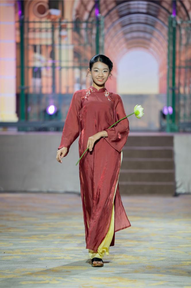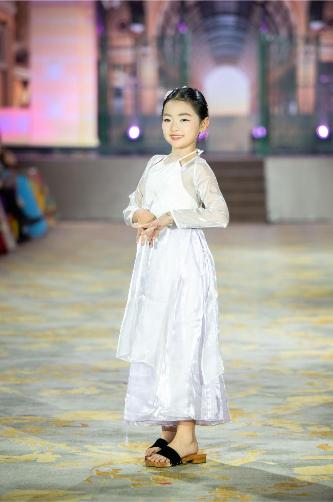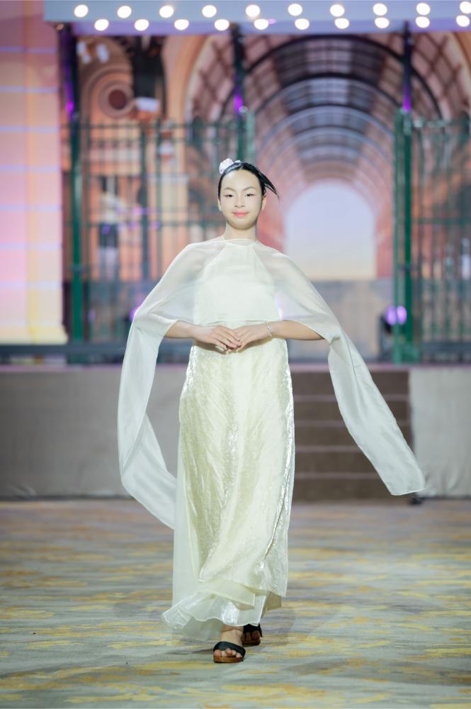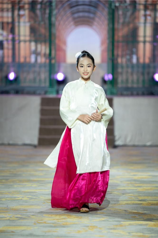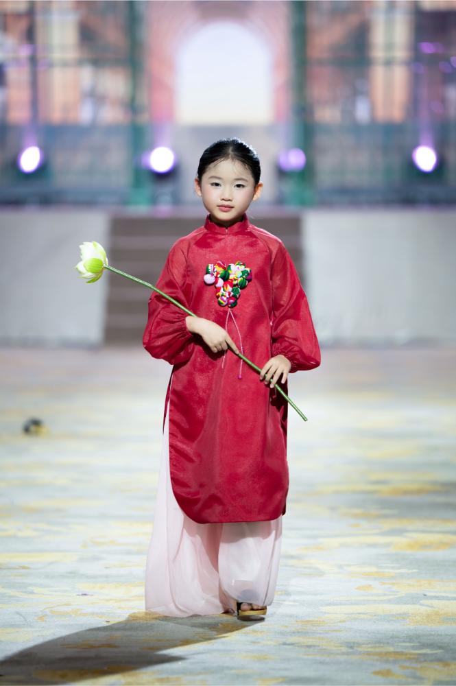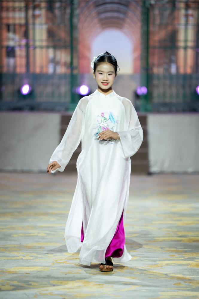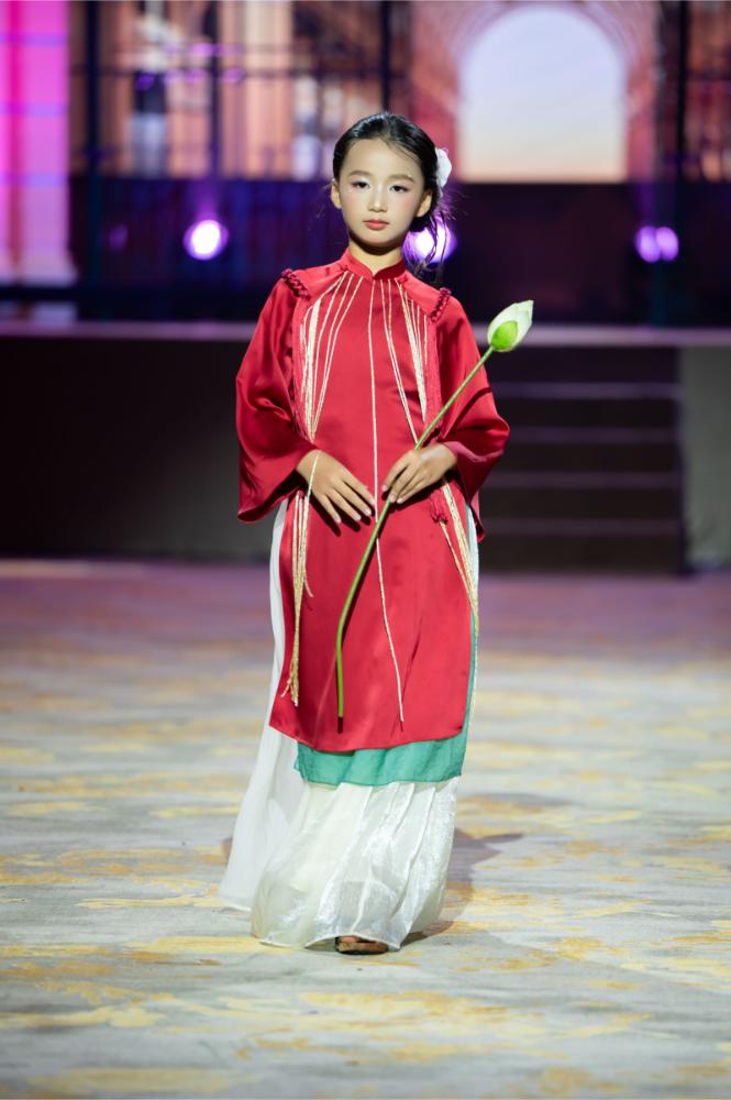 Ở vị trí Vedette, Trần Thị Ngọc Mai – Quán quân hạng mục “Model” tại Cosmo Kid’s Star 2025, khép lại phần mở màn với phong thái rạng rỡ trong thiết kế áo dài “Thịnh Tuất”, lấy cảm hứng từ đại ngàn Tây Nguyên. Sinh năm 2015, Ngọc Mai gây ấn tượng nhờ kỹ năng catwalk vững vàng và sự tự tin vượt tuổi, nhiều lần đảm nhận vai trò Vedette trên các sàn diễn lớn.