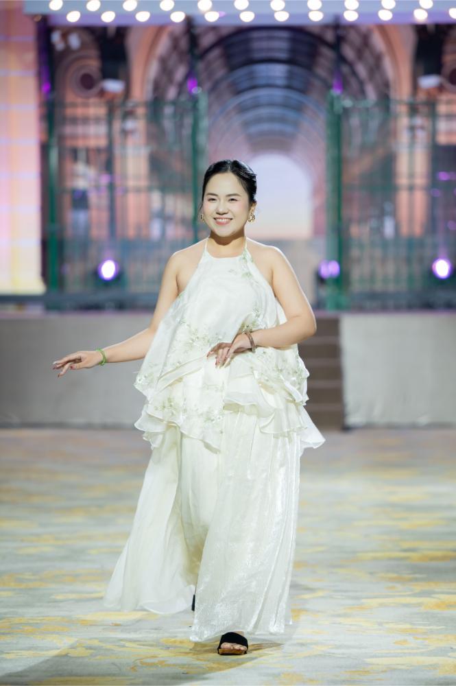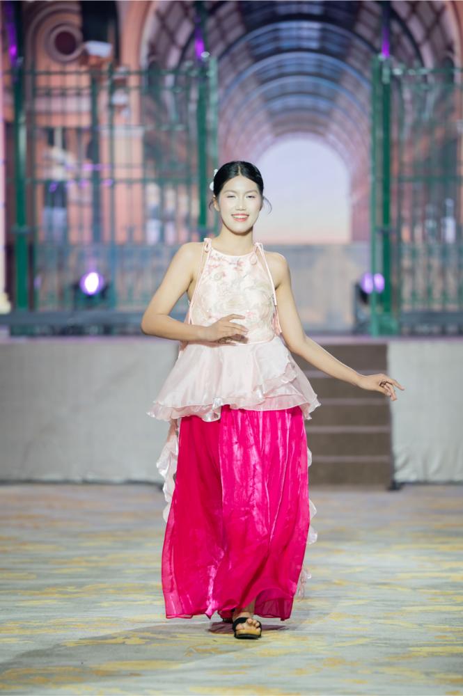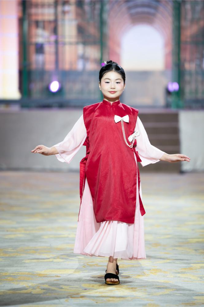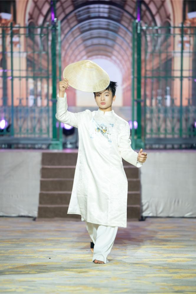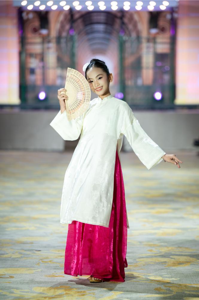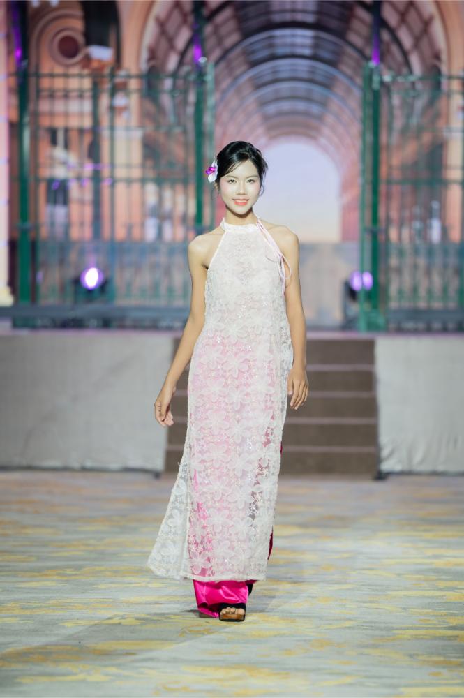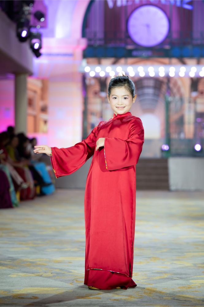 Ở vị trí Vedette, Trần Thị Ngọc Mai – Quán quân hạng mục “Model” tại Cosmo Kid’s Star 2025, khép lại phần mở màn với phong thái rạng rỡ trong thiết kế áo dài “Thịnh Tuất”, lấy cảm hứng từ đại ngàn Tây Nguyên. Sinh năm 2015, Ngọc Mai gây ấn tượng nhờ kỹ năng catwalk vững vàng và sự tự tin vượt tuổi, nhiều lần đảm nhận vai trò Vedette trên các sàn diễn lớn.