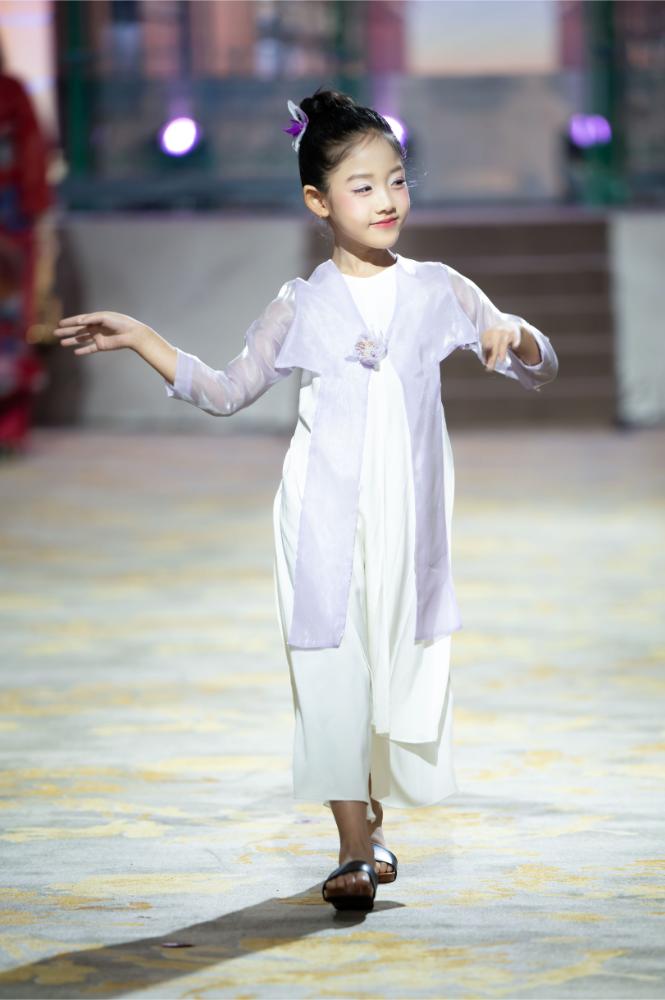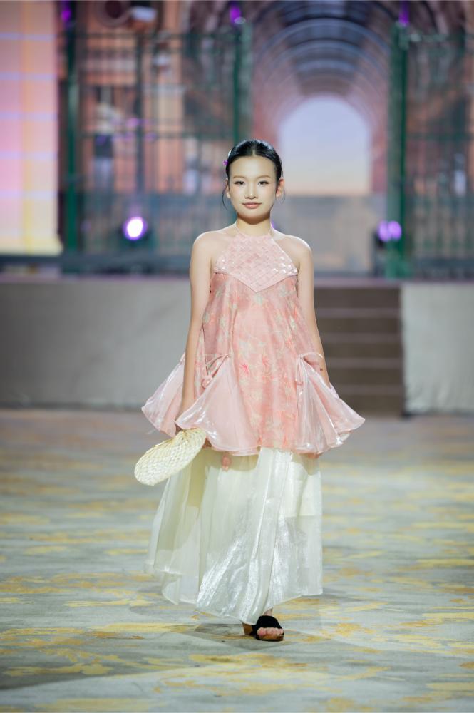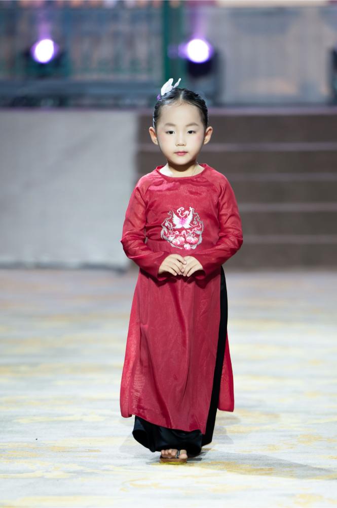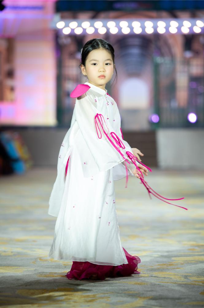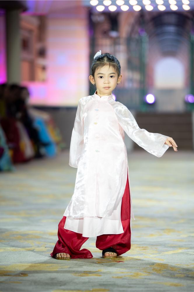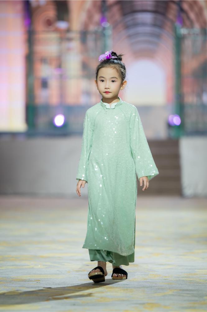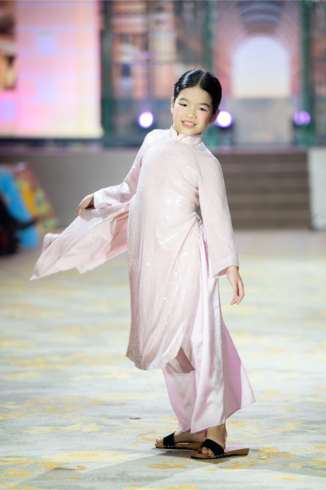 Trên sàn diễn, 36 mẫu nhí từ Học viện Cosmo Academy thể hiện sự tự tin và kỹ năng catwalk tốt. Dù còn nhỏ tuổi, các em cho thấy sự tập trung và chỉn chu trong từng biểu cảm, tạo nên đêm diễn trọn vẹn. Mở đầu là bộ sưu tập “Whisper of Seasons” của Eunoia by An, gồm ba phần là “Niên Ca”, “Tuổi May Mắn” và “Lễ Hội”. “Niên Ca” tái hiện hình ảnh áo dài trẻ em qua các thiết kế Tứ Thân hiện đại, phối màu pastel dịu nhẹ, điểm xuyết hoa vải thủ công qua chất liệu “chăn con công”.