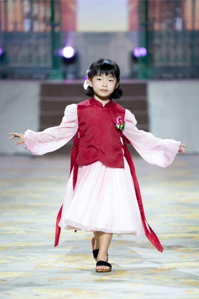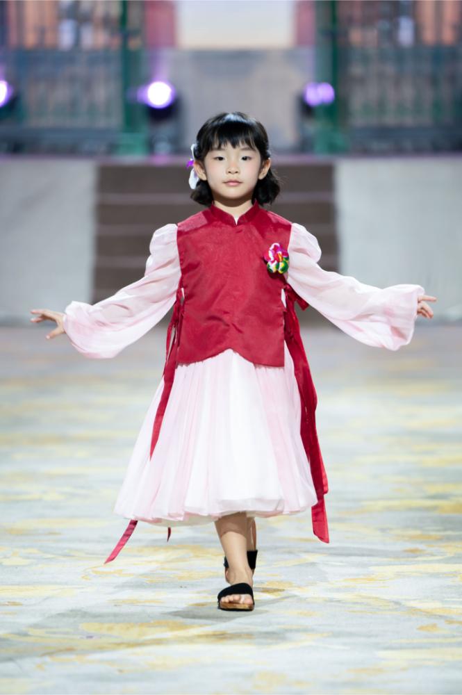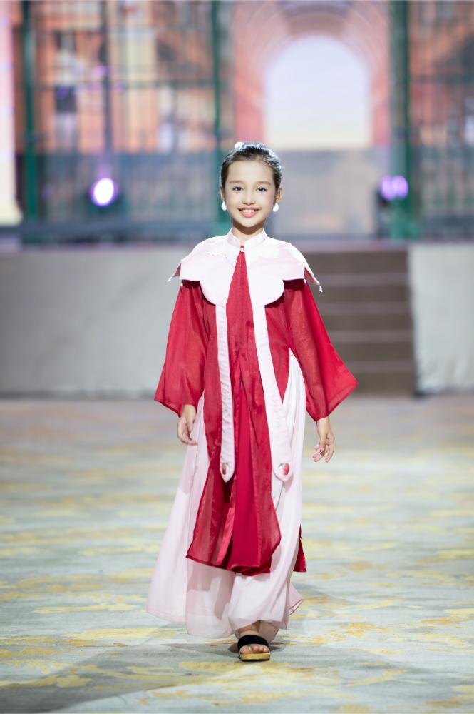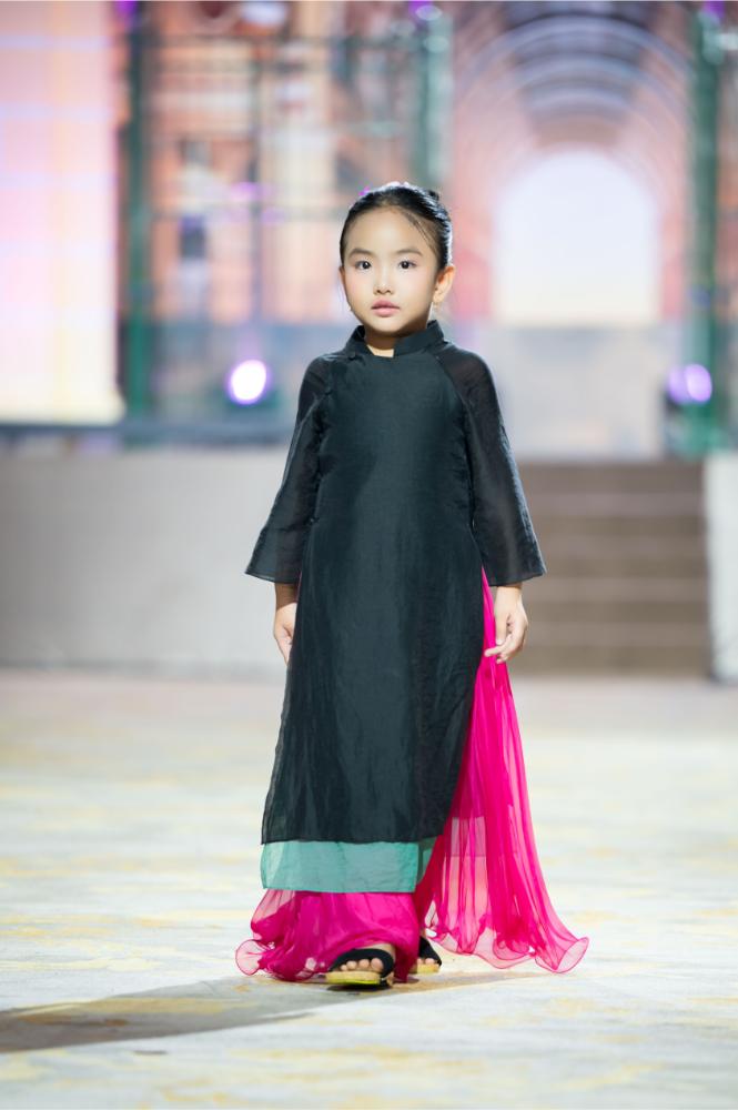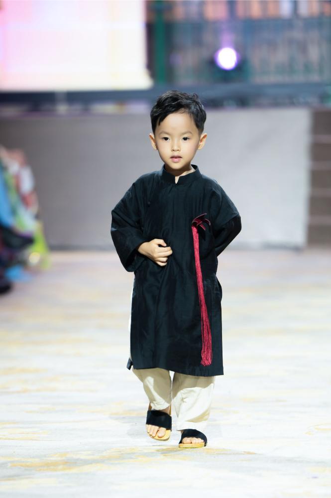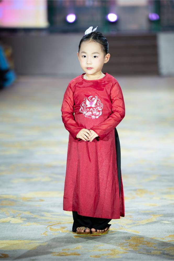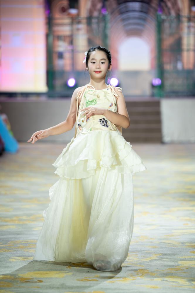 Trên sàn diễn, 36 mẫu nhí từ Học viện Cosmo Academy thể hiện sự tự tin và kỹ năng catwalk tốt. Dù còn nhỏ tuổi, các em cho thấy sự tập trung và chỉn chu trong từng biểu cảm, tạo nên đêm diễn trọn vẹn. Mở đầu là bộ sưu tập “Whisper of Seasons” của Eunoia by An, gồm ba phần là “Niên Ca”, “Tuổi May Mắn” và “Lễ Hội”. “Niên Ca” tái hiện hình ảnh áo dài trẻ em qua các thiết kế Tứ Thân hiện đại, phối màu pastel dịu nhẹ, điểm xuyết hoa vải thủ công qua chất liệu “chăn con công”.
