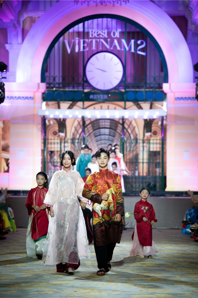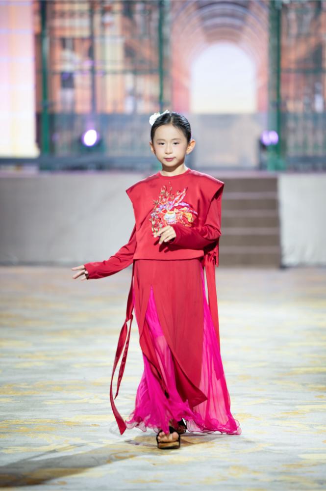 Phần “Tuổi May Mắn” sử dụng bảng màu rực rỡ, kết hợp giữa nét đẹp cổ điển ngày Tết và hơi thở hiện đại. Bộ sưu tập khai thác chất liệu lụa voan cao cấp nhập khẩu, với họa tiết 12 con giáp thêu tay tỉ mỉ, tái hiện áo dài truyền thống qua nhiều phom dáng như yếm cổ điển, dáng bất đối xứng và cấu trúc 3D ngộ nghĩnh. Khép lại phần “Whisper of Seasons”, bộ sưu tập “Lễ Hội” giới thiệu những thiết kế áo dài kết hợp lụa tơ tằm mềm mại cùng kỹ thuật đính kết Sequin cao cấp, tạo hiệu ứng ánh sáng lấp lánh đặc trưng. Từ sắc đỏ nhung mạnh mẽ cho bé trai đến gam xanh mint và hồng phấn ánh kim dành cho bé gái, mỗi thiết kế đều được may đo thủ công, tinh chỉnh tỉ mỉ trong từng đường kim mũi chỉ.
