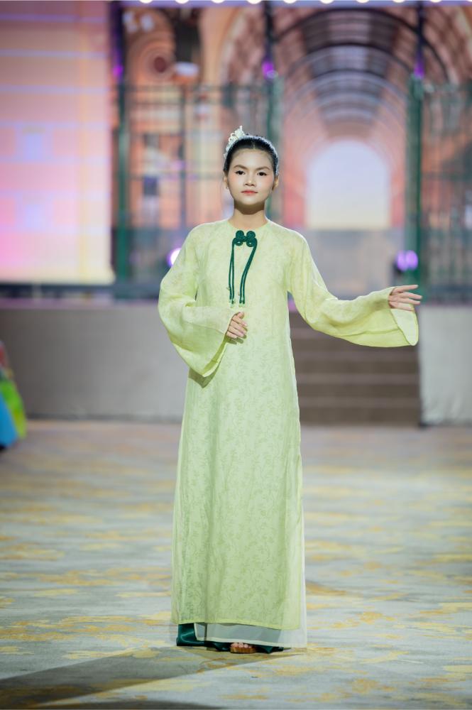 Tiếp nối chương trình là bộ sưu tập “Linh Lung – Xuân Sang” của OLV (10 thiết kế) và LOREN (4 thiết kế). “Linh Lung” lấy cảm hứng từ hoa sen nhẹ lay trên mặt nước, thể hiện qua phom áo dài và yếm mềm mại, tôn vinh vẻ đẹp truyền thống của người phụ nữ Việt với đường cắt thanh thoát. Giữ vai trò Vedette, Nguyễn Phan Bảo Ngọc gây ấn tượng với khả năng làm chủ sân khấu và thần thái tự tin. Diện áo dài xanh ngọc với đường nét tinh tế, Bảo Ngọc trở thành điểm nhấn của bộ sưu tập. Sinh năm 2012, em là Quán quân hạng mục “Dance” tại Cosmo Kid’s Star 2024, thường xuyên được NTK chọn làm First Face và Vedette, tiêu biểu trong các chương trình: In Space của NTK Trinh Châu, Angel Wish Kids 2022 – 2023, Moon Fashion Show và Long Lân Phụng của NTK Kim Trọng.