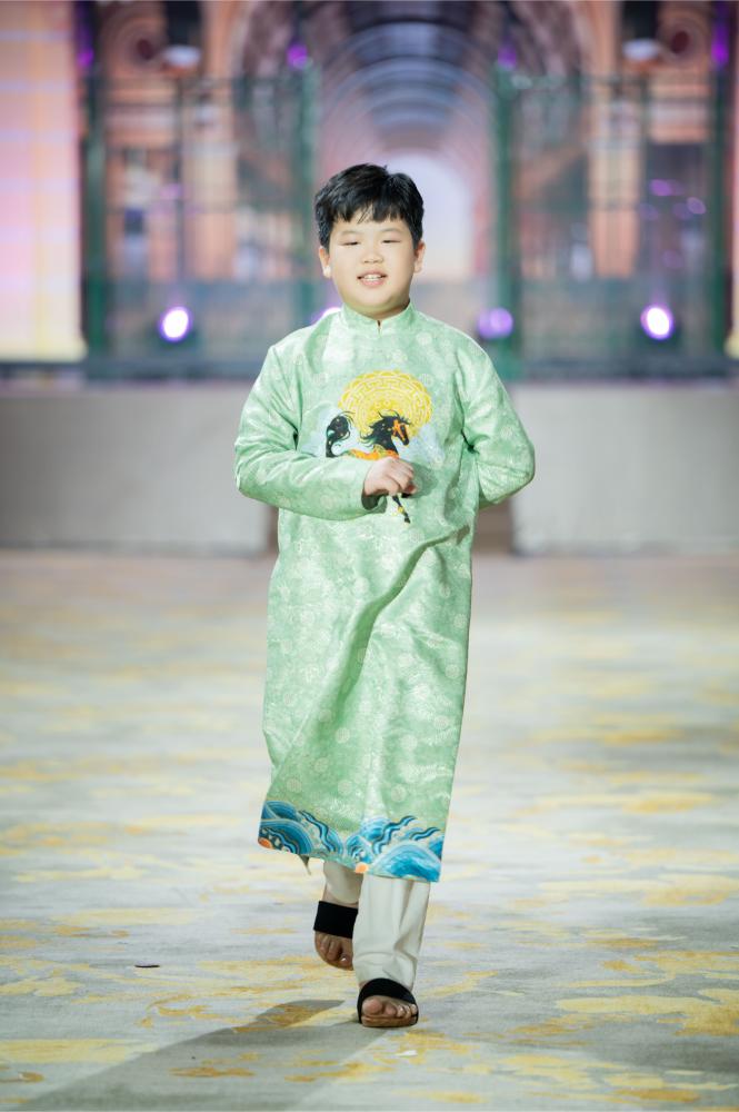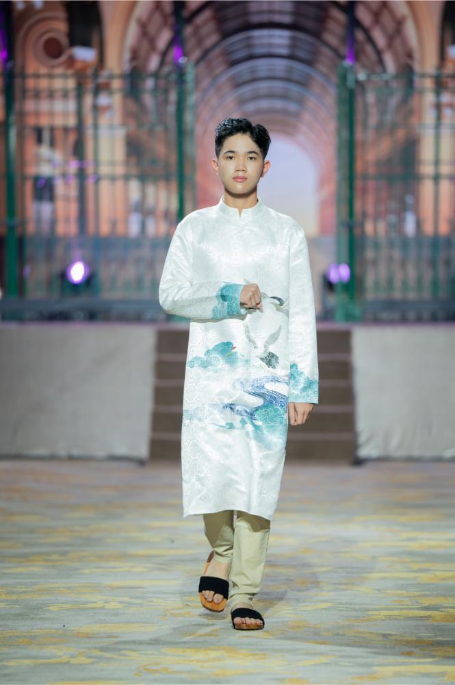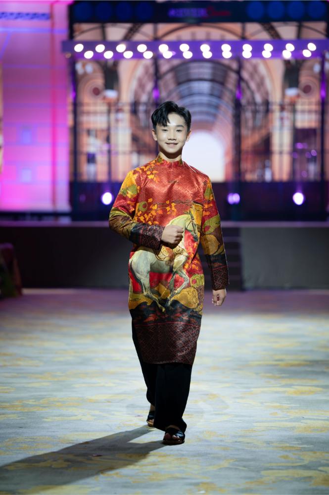 Trong khi đó, “Xuân Sang” của LOREN giới thiệu các mẫu áo dài bé trai, sử dụng tông màu ấm, đường cắt chỉn chu và tinh thần Á Đông hiện đại. Chương trình khép lại với sự xuất hiện của Vũ Bá Minh Đăng – Quán quân hạng mục “Dance” tại Cosmo Kid’s Star 2025. Sinh năm 2011, Minh Đăng được đánh giá cao về kỹ thuật vũ đạo, khả năng truyền tải cảm xúc và sự tự tin trên sân khấu. Trong mẫu áo dài LOREN, em thể hiện khí chất dứt khoát, tạo dấu ấn trọn vẹn cho màn kết. Ngoài nghệ thuật, Minh Đăng còn nổi bật trong học tập, yêu thích thể thao và tích cực tham gia các hoạt động phong trào.