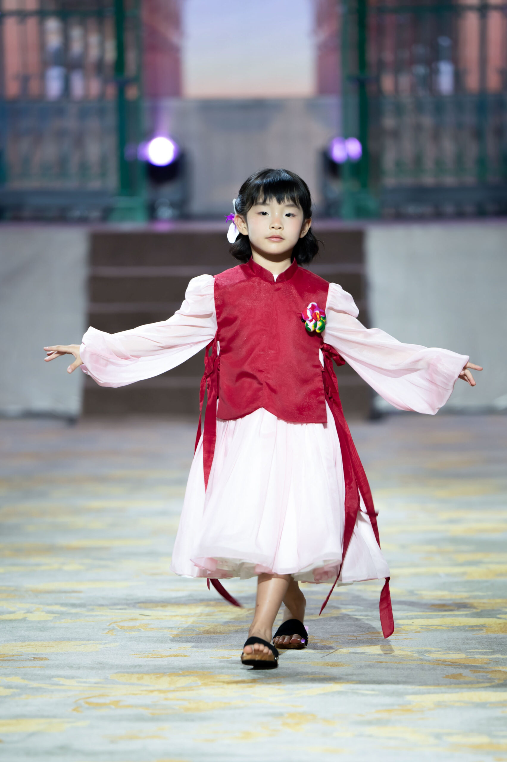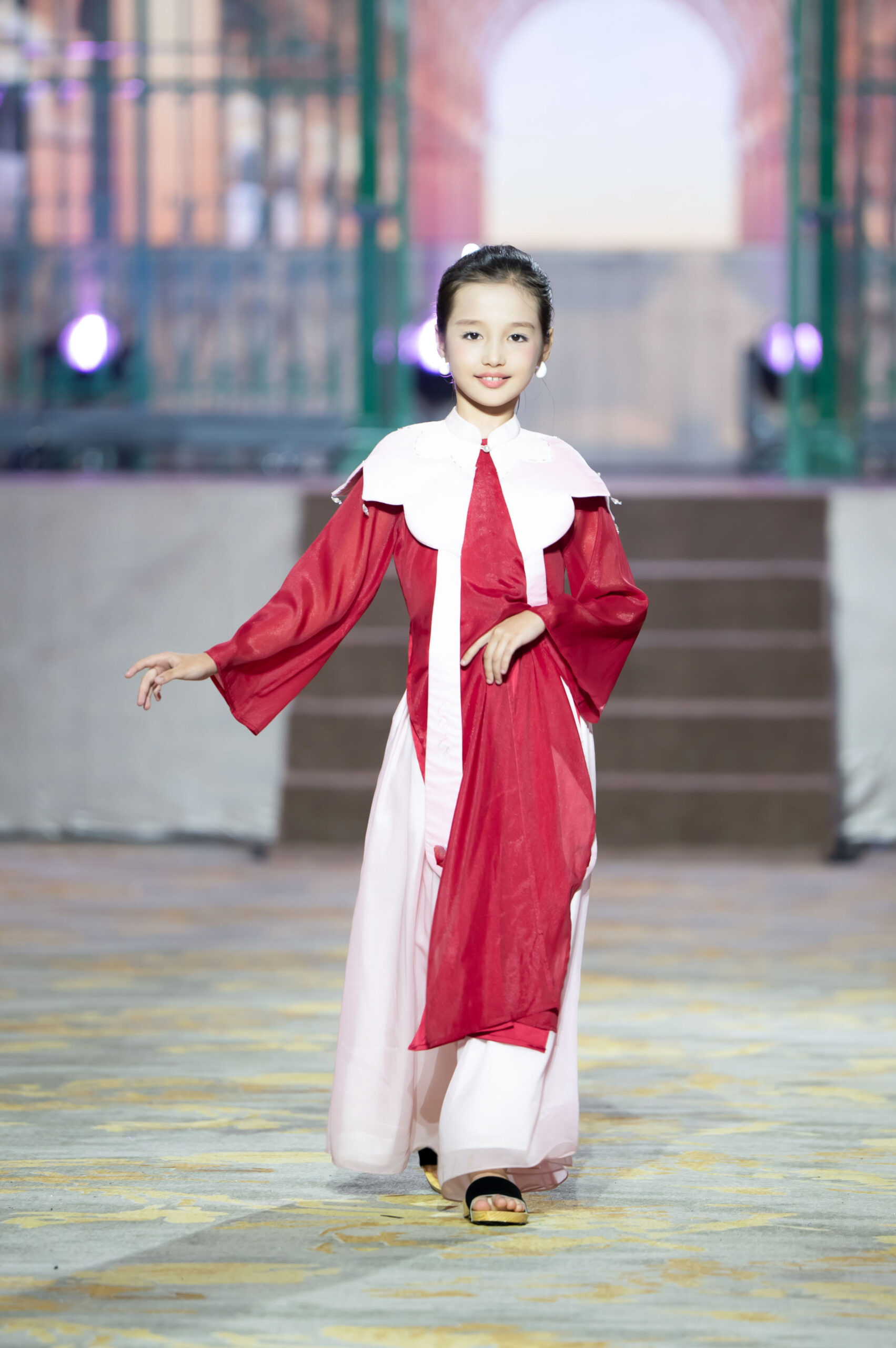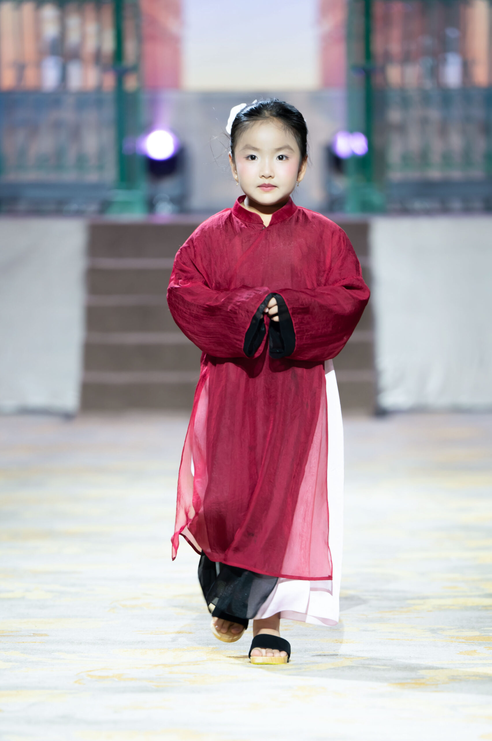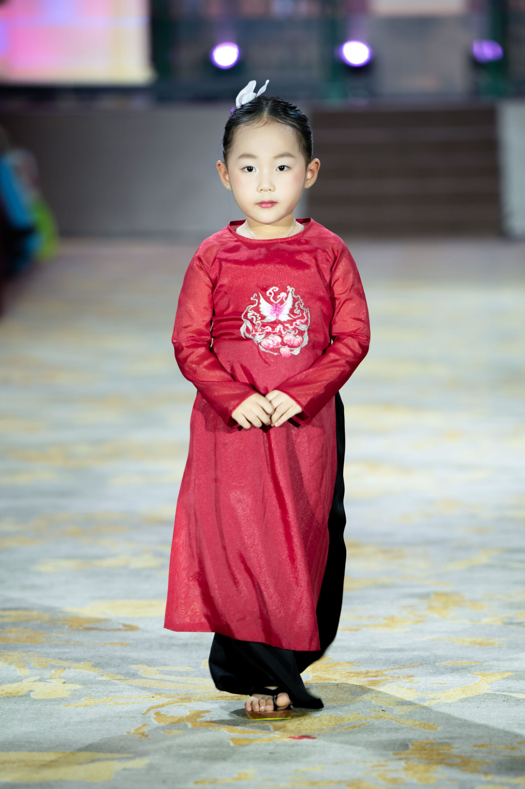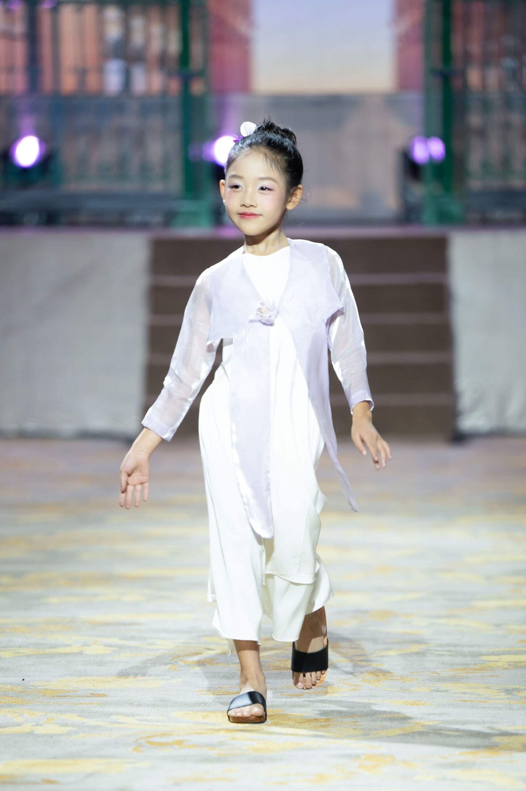 Trên sàn diễn, 36 mẫu nhí từ Học viện Cosmo Academy thể hiện sự tự tin và kỹ năng catwalk tốt. Dù còn nhỏ tuổi, các em cho thấy sự tập trung và chỉn chu trong từng biểu cảm, tạo nên đêm diễn trọn vẹn. Mở đầu là bộ sưu tập “Whisper of Seasons” của Eunoia by An, gồm ba phần là “Niên Ca”, “Tuổi May Mắn” và “Lễ Hội”. “Niên Ca” tái hiện hình ảnh áo dài trẻ em qua các thiết kế Tứ Thân hiện đại, phối màu pastel dịu nhẹ, điểm xuyết hoa vải thủ công qua chất liệu “chăn con công”.