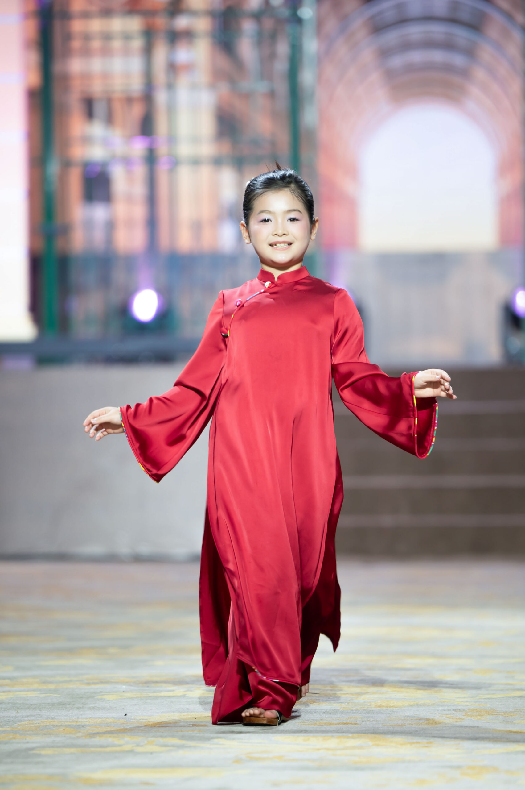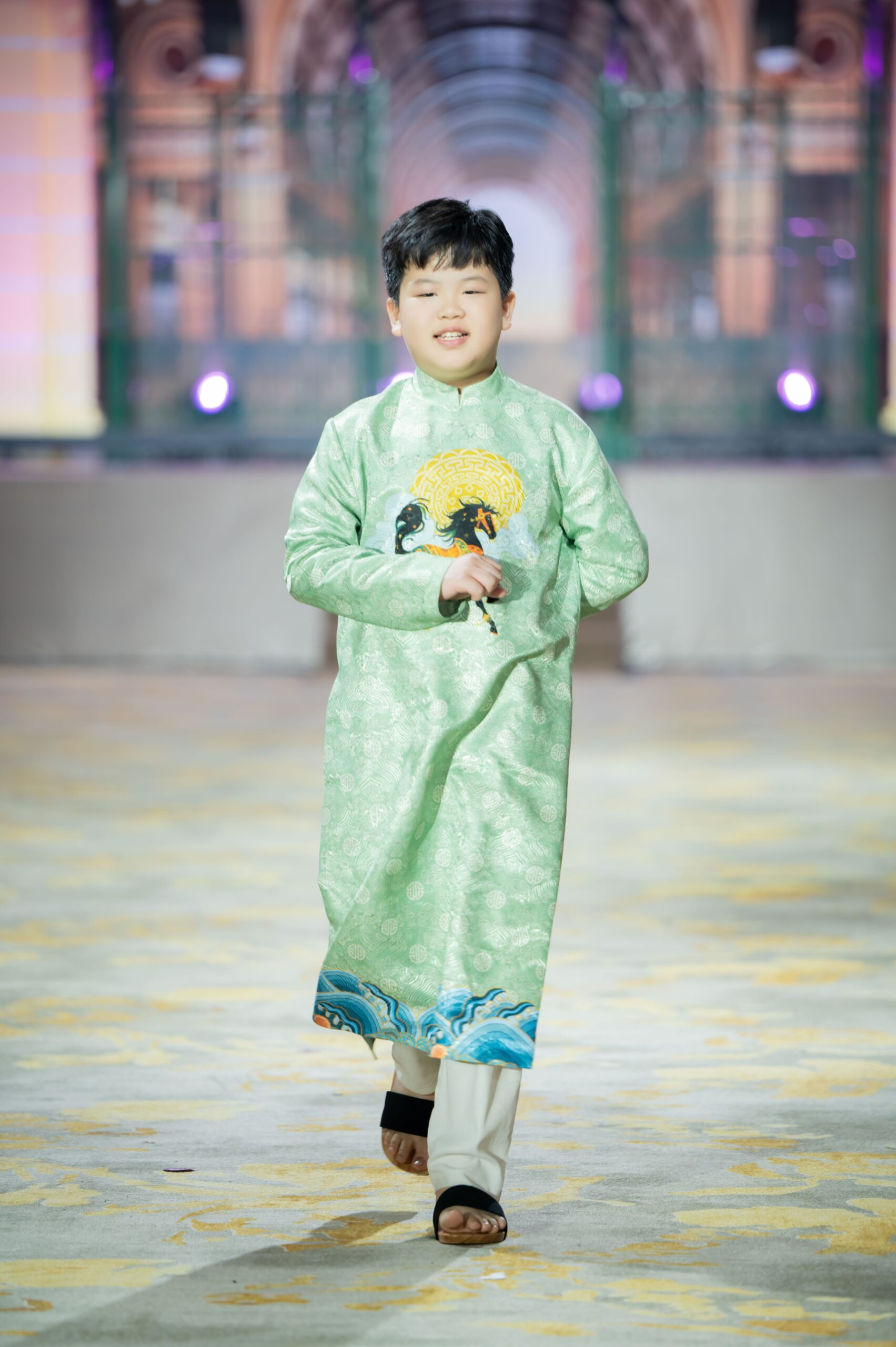 Phần “Tuổi May Mắn” sử dụng bảng màu rực rỡ, kết hợp giữa nét đẹp cổ điển ngày Tết và hơi thở hiện đại. Bộ sưu tập khai thác chất liệu lụa voan cao cấp nhập khẩu, với họa tiết 12 con giáp thêu tay tỉ mỉ, tái hiện áo dài truyền thống qua nhiều phom dáng như yếm cổ điển, dáng bất đối xứng và cấu trúc 3D ngộ nghĩnh. Khép lại phần “Whisper of Seasons”, bộ sưu tập “Lễ Hội” giới thiệu những thiết kế áo dài kết hợp lụa tơ tằm mềm mại cùng kỹ thuật đính kết Sequin cao cấp, tạo hiệu ứng ánh sáng lấp lánh đặc trưng. Từ sắc đỏ nhung mạnh mẽ cho bé trai đến gam xanh mint và hồng phấn ánh kim dành cho bé gái, mỗi thiết kế đều được may đo thủ công, tinh chỉnh tỉ mỉ trong từng đường kim mũi chỉ.