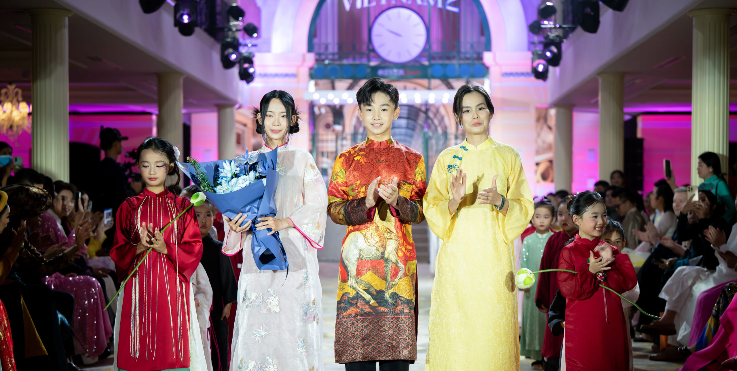 Ở vị trí Vedette, Trần Thị Ngọc Mai – Quán quân hạng mục “Model” tại Cosmo Kid’s Star 2025, khép lại phần mở màn với phong thái rạng rỡ trong thiết kế áo dài “Thịnh Tuất”, lấy cảm hứng từ đại ngàn Tây Nguyên. Sinh năm 2015, Ngọc Mai gây ấn tượng nhờ kỹ năng catwalk vững vàng và sự tự tin vượt tuổi, nhiều lần đảm nhận vai trò Vedette trên các sàn diễn lớn.