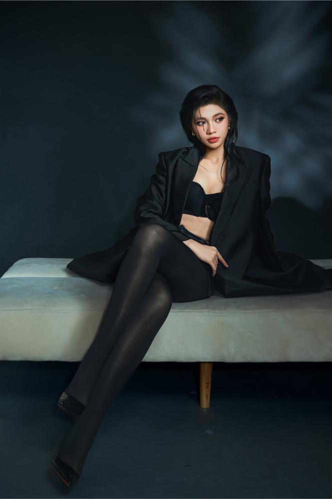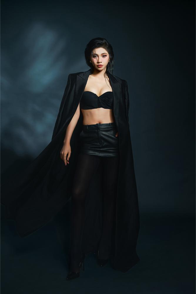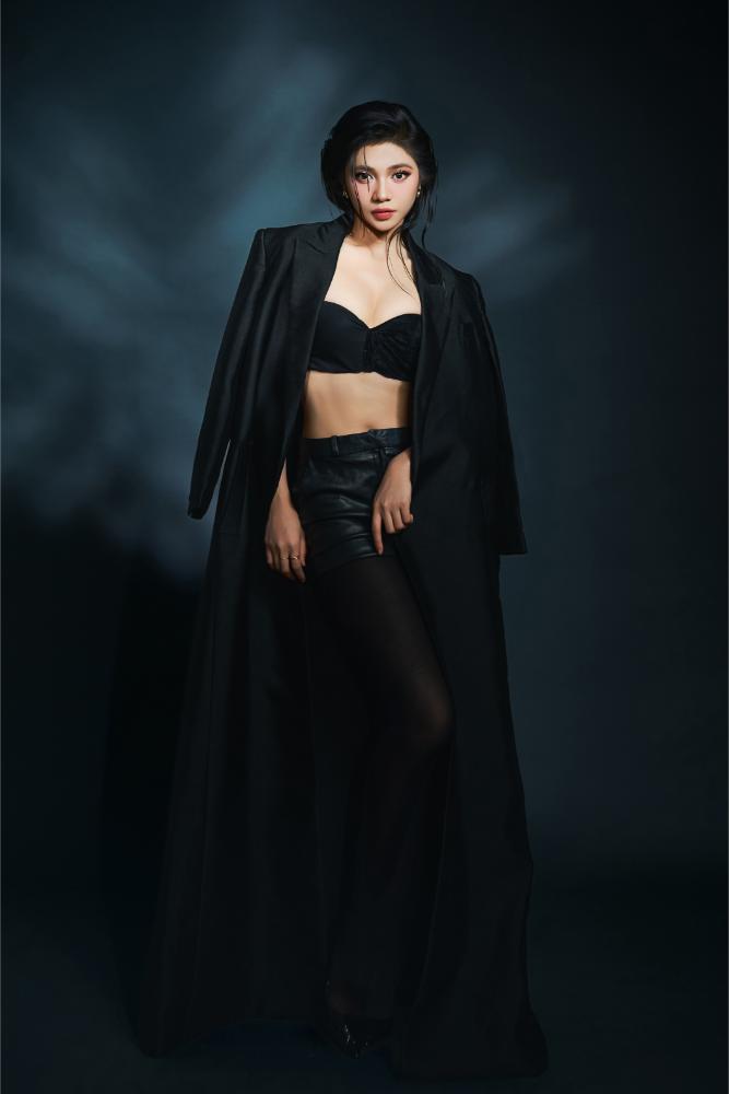 Trong layout thứ hai, Minh Kiên hoàn toàn “lột xác” với tinh thần thời trang hiện đại. Phần áo cúp ngực ôm sát giúp phô diễn đường nét cơ thể một cách tinh tế, kết hợp blazer khoác hờ trên vai tạo nên sự đối lập thú vị giữa nét gợi cảm và vẻ mạnh mẽ.