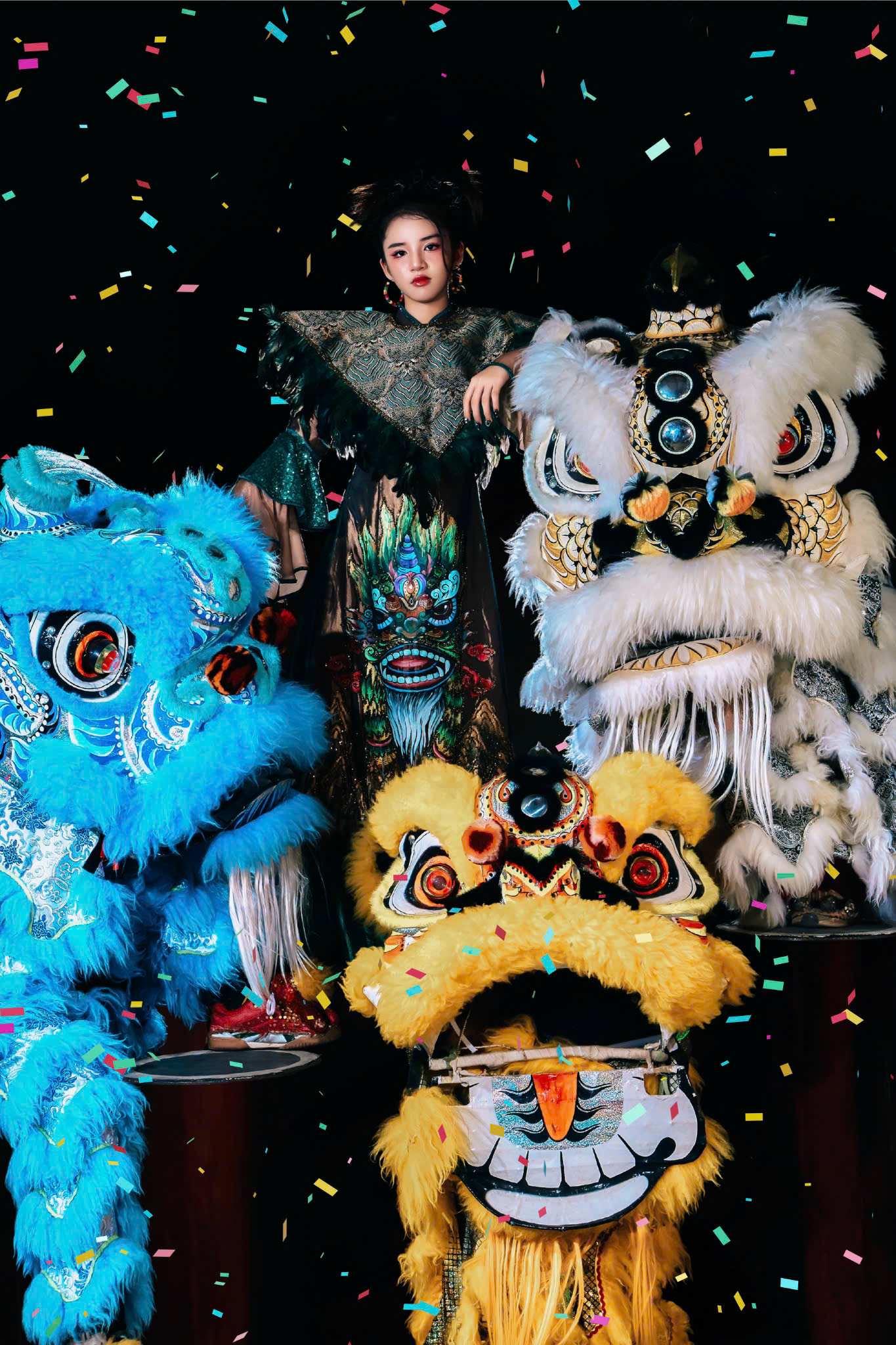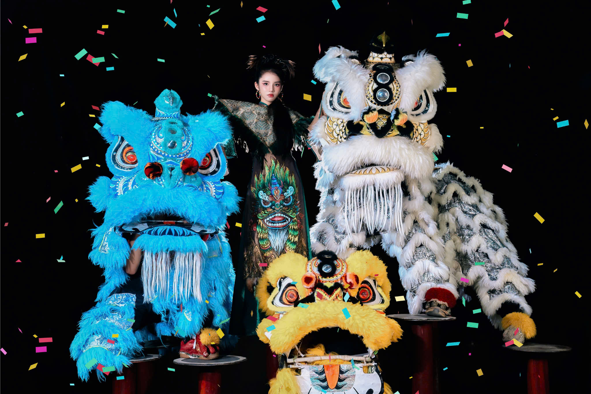 Trong từng khung hình, Minh Châu hóa thân thành nàng tiên mùa trăng, nổi bật giữa những chú lân xanh, vàng, trắng. Các thiết kế áo dài được thêu thùa tỉ mỉ với hình ảnh long – lân – phụng, không chỉ mang tính thẩm mỹ cao mà còn ẩn chứa thông điệp về sự gìn giữ, phát huy giá trị văn hóa dân tộc.