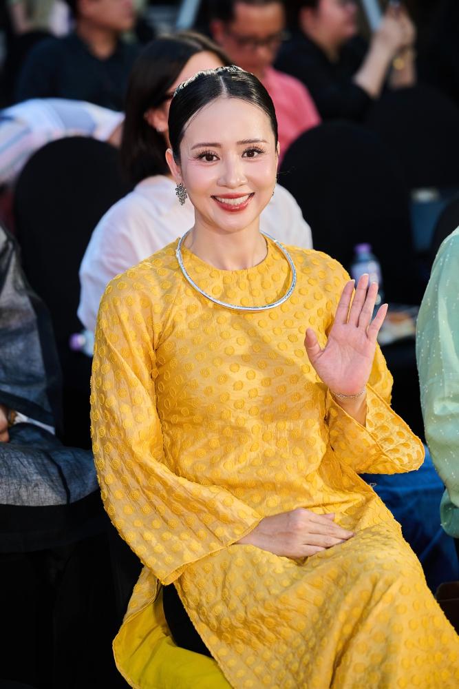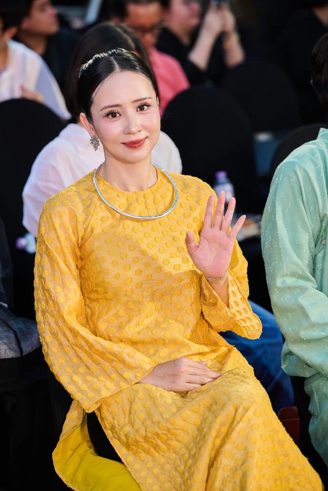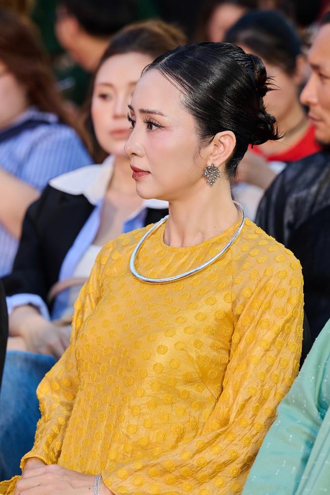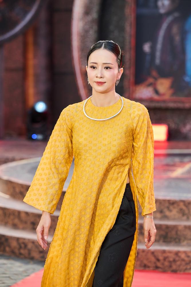 Giữa không gian đậm chất cổ trang của buổi showcase, Thúy Hiền lại gây ấn tượng theo một cách rất khác. Không còn lớp giáp chiến binh trên màn ảnh, cô chọn diện áo dài vàng truyền thống, thiết kế tối giản nhưng tinh tế, tôn lên vẻ đẹp nền nã và thanh lịch. Mái tóc búi gọn, lối trang điểm nhẹ nhàng cùng thần thái điềm tĩnh giúp cô nổi bật theo cách rất “đàn bà Việt”, một sự đối lập thú vị với hình ảnh tráng sĩ mạnh mẽ trong phim.