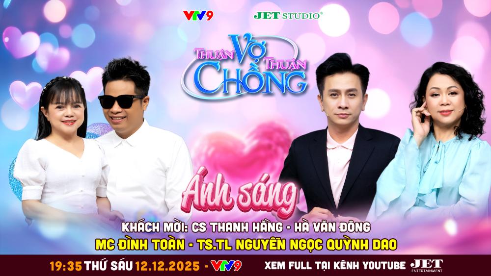 Thuận Vợ Thuận Chồng với câu chuyện “Ánh sáng” của đôi vợ chồng Thanh Hằng – Hà Văn Đông sẽ phát sóng lúc 19:35, thứ Sáu ngày 12/12/2025 trên kênh VTV9. Chương trình do VTV9 phối hợp cùng Jet Studio thực hiện.