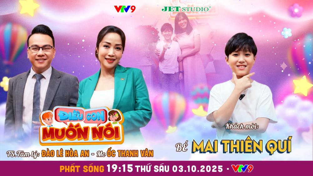Điều Con Muốn Nói tập 13 với những tâm sự của bé Mai Thiên Quí sẽ được phát sóng vào lúc 19h15 thứ Sáu 3/10/2025 trên VTV9. Chương trình Điều Con Muốn Nói do VTV9 phối hợp Jet Studio thực hiện.