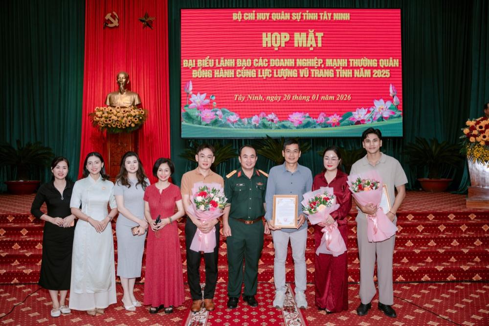 Hoa hậu Hoàng Thanh Nga bày tỏ niềm xúc động và tự hào sâu sắc khi vinh dự được Bộ Chỉ huy Quân sự tỉnh Tây Ninh trao tặng Bằng khen trong buổi họp mặt trang trọng, ấm áp nghĩa tình.