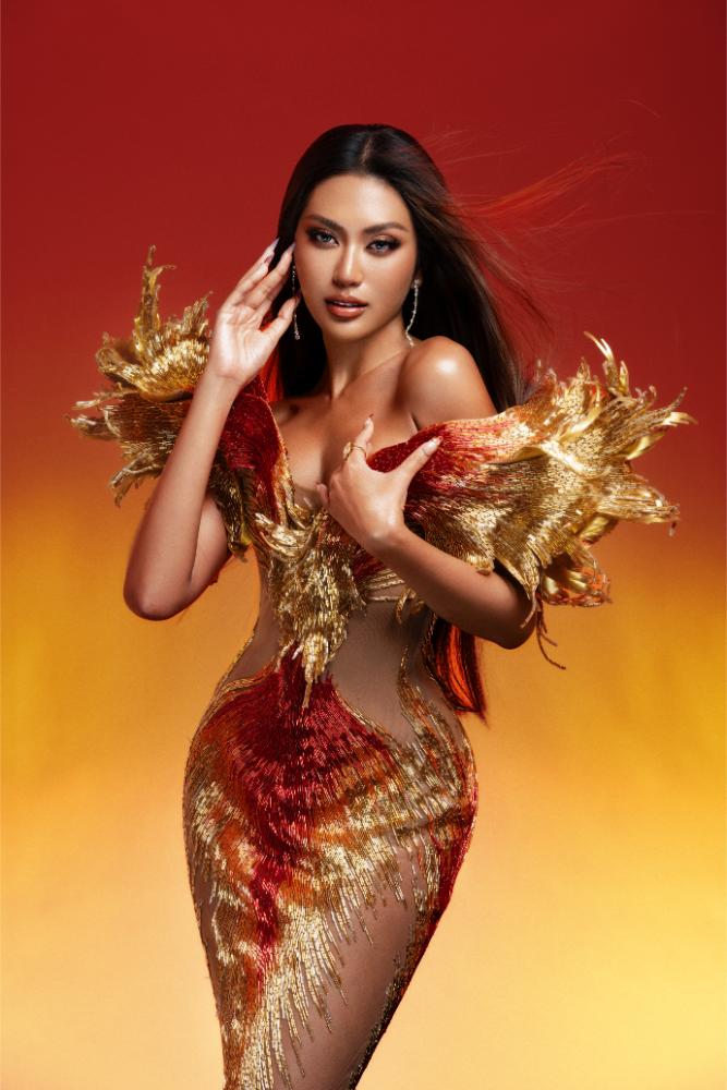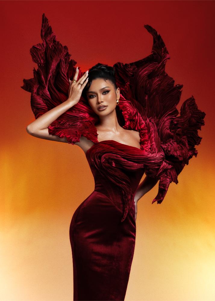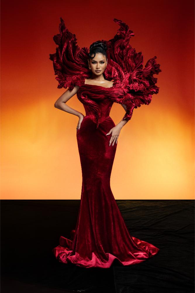 Song hành cùng đương kim Hoa hậu, Á hậu Mook Karnruethai Tassabut gây ấn tượng với thiết kế “Vương Miện Lửa”, biểu trưng cho quyền lực và sức hấp dẫn nội tại. Chiếc đầm nhung đỏ được tạo khối mềm mại, với những nếp gấp tựa sóng lửa ôm lấy cơ thể, toát lên vẻ cuốn hút. Thiết kế là sự giao hòa giữa hiện thực và nghệ thuật, tôn vinh hình ảnh người phụ nữ tự tin và kiên định, luôn tỏa sáng trên hành trình khẳng định chính mình.