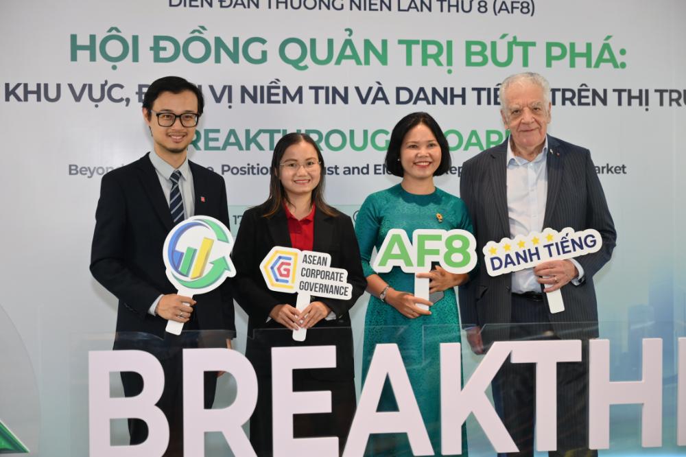 Các điểm nhấn và sáng kiến nổi bật về QTCT tại AF8 năm nay tập trung giới thiệu sáng kiến “ACGS20 – Khát vọng Vươn tầm Khu vực”, với nhóm 20 doanh nghiệp Doanh nghiệp cam kết & tiên phong hướng tới đạt chuẩn xếp hạng Tài sản ASEAN; Công bố Top VNCG50 2025 – Tôn vinh Doanh nghiệp tiên phong cam kết thực hành QTCT tốt và hướng tới bộ chỉ số VNCG50; Vinh danh Top 05 “Hội đồng Quản trị của năm” 2025 & 01 “Hội đồng Quản trị đa dạng” – Tôn vinh các HĐQT tiêu biểu tiên phong cam kết thực hành QTCT tốt.