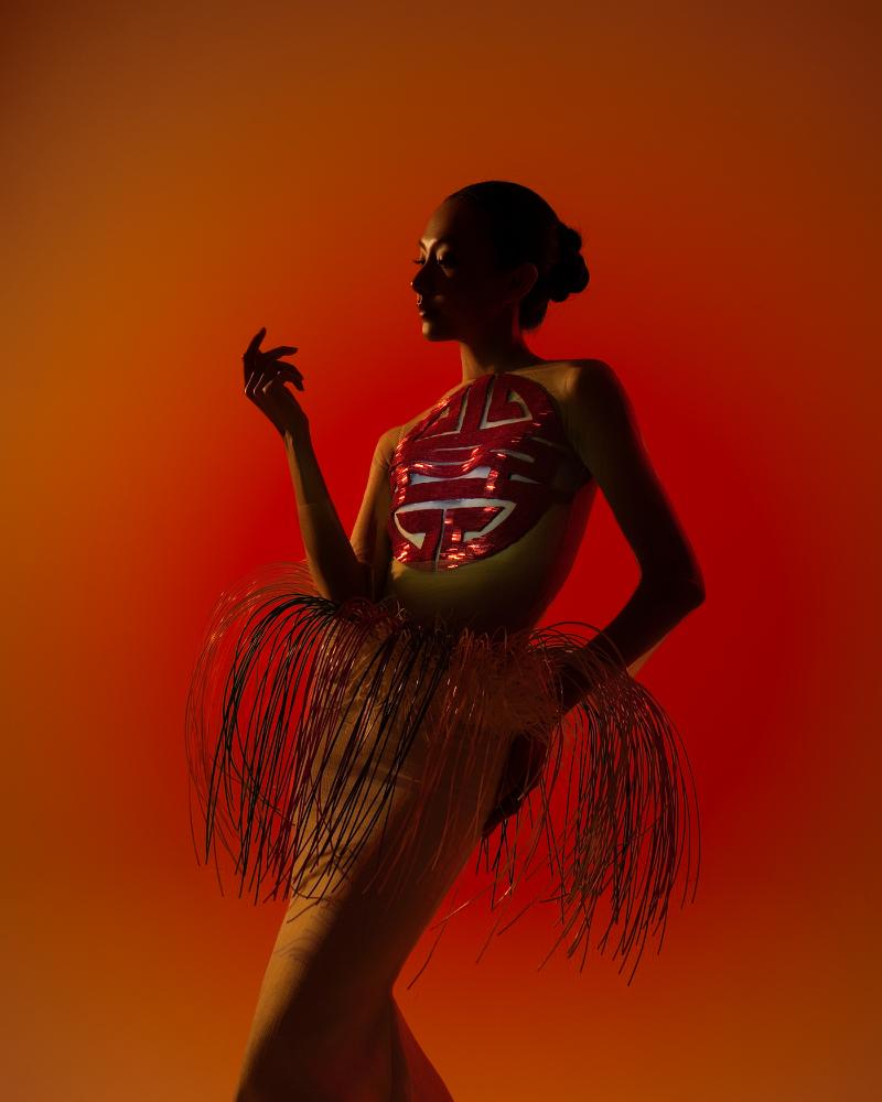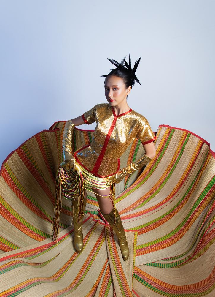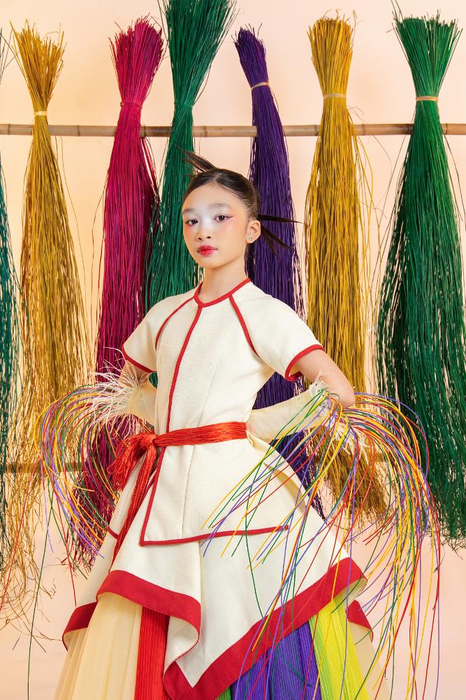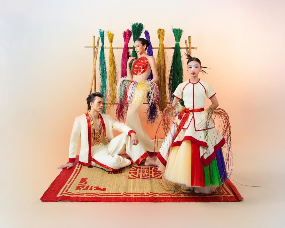 BÁT “Sắc chiếu dệt tình” sử dụng tông vàng ngả làm chủ đạo, được điểm xuyến bởi những đường viền đỏ gợi nhớ rõ nét đến gam màu quen thuộc trên những tấm chiếu làng Định Yên. Trên nền màu sắc ấy, các thiết kế được triển khai với phom dáng hiện đại như đầm đuôi cá, áo vest, váy bồng xòe, nhưng vẫn giữ tinh thần truyền thống qua những chi tiết gợi nhắc áo bà ba và họa tiết chữ “Hỷ” cách điệu trên thân áo. Nhiều trang phục được đính kết thêm các dải sợi rực rỡ đủ màu, tạo hiệu ứng thị giác mạnh và khiến người xem dễ dàng liên tưởng đến những sợi cói chuẩn bị đưa vào khung dệt.