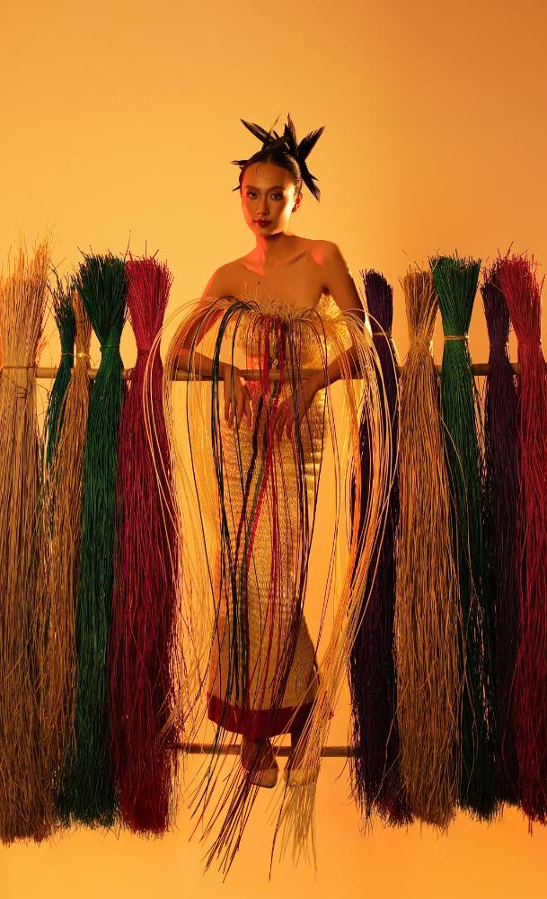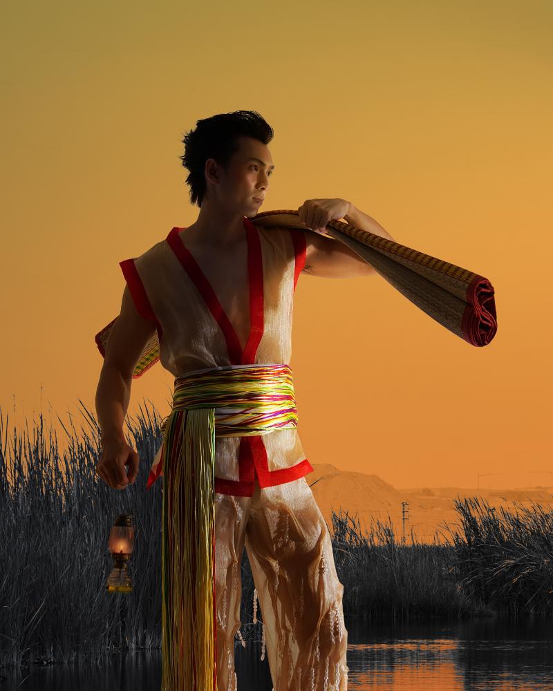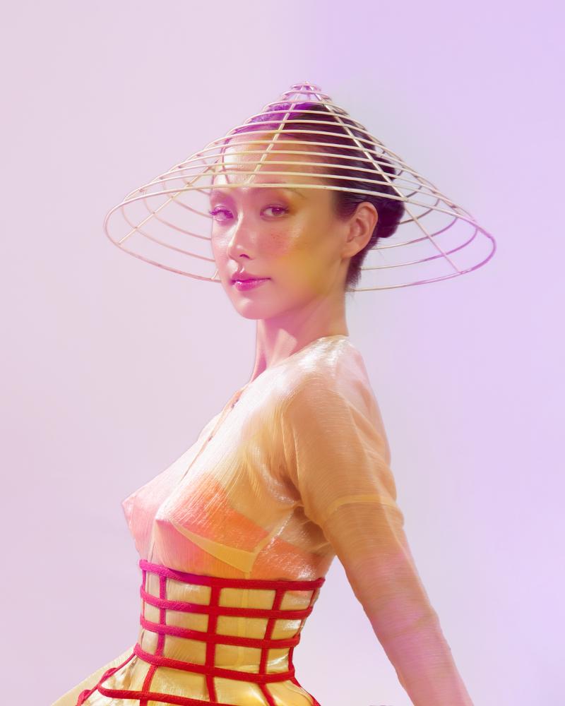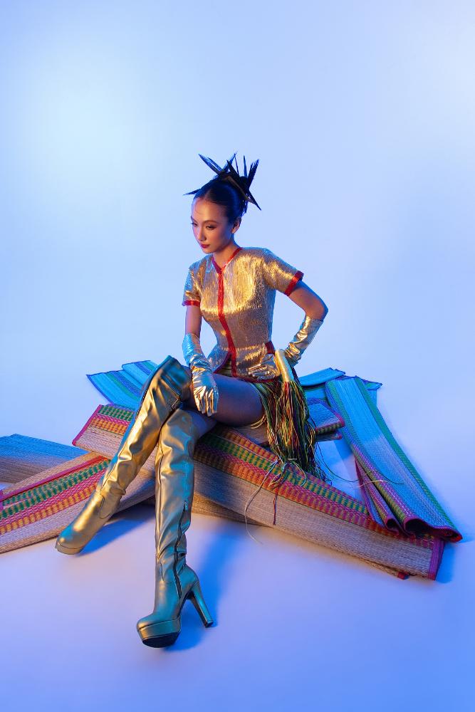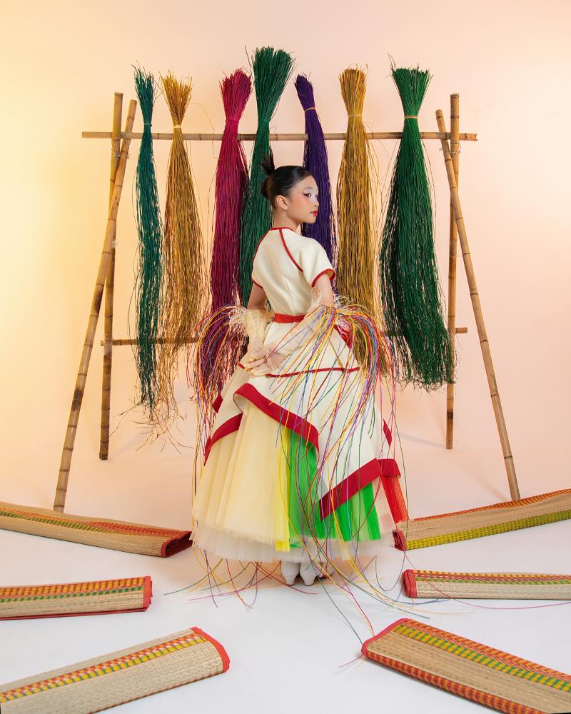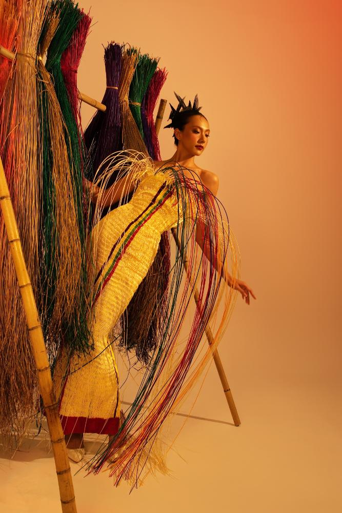 Không chỉ dừng lại ở thiết kế, Bùi Hoàng Ân còn đầu tư đáng kể cho phần hình ảnh. Bộ ảnh lookbook được xây dựng như một câu chuyện hoàn chỉnh, thay vì chỉ là những khuôn hình nhằm phô diễn trang phục. Hơn 20 chiếc chiếu cùng hàng trăm sợi cói được mua trực tiếp từ làng Định Yên và được đặt để tinh tế giúp xây dựng bối cảnh trở nên sống động.