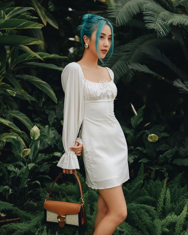 Liên tục biến hóa với phong cách cá tính nhưng hóa thân thành thiếu nữ dịu dàng với mái tóc xanh thời thượng cũng chẳng làm khó được Quỳnh Anh Shyn. Một chiếc đầm trắng tay phồng cổ tích tôn lên vòng eo thon thả kết hợp cùng chiếc túi xách đơn giản, bấy nhiêu thôi đã đủ để cô nàng có thể xuống phố chơi hè cực chất rồi.