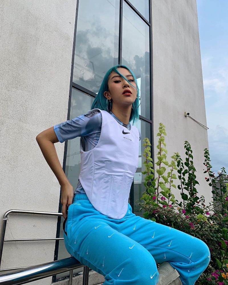 Áo thun kết hợp sweatpants là phép cộng ăn điểm đơn giản cho những cô nàng năng động và sở hữu dáng người lý tưởng như Quỳnh Anh Shyn. Nhấn thêm tổng thể bằng khoác ngoài ôm sát cơ thể, kết hợp đôi boots trơn khiến nữ fashionista càng sành điệu và cá tính hơn với màu tóc xanh pastel này.