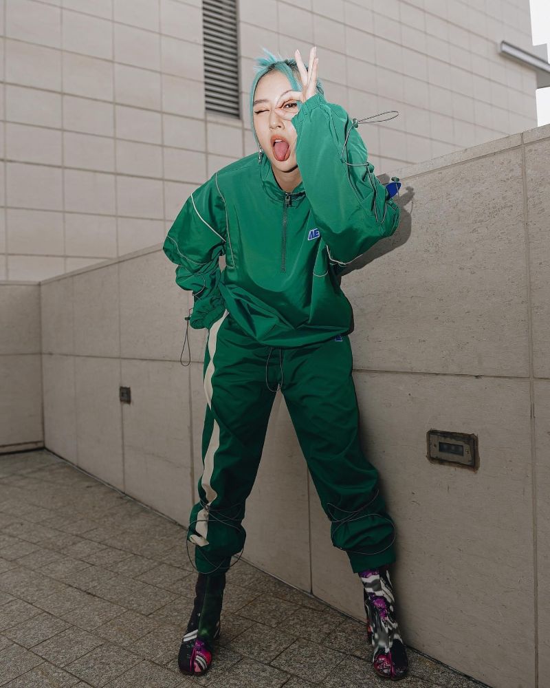 Xanh lá và xanh dương? Nghe thì có vẻ chẳng liên quan gì cả nhưng Quỳnh Anh Shyn vẫn tự tin “chơi” cả bộ tracksuit xanh lá đi kèm mái tóc của mình. Dù trendy nhưng xanh lá là gam màu khá khó mặc, dễ dàng “dìm” những cô nàng da ngăm nhưng với cô nàng rõ ràng là không. Có thể đây là một ý tưởng tránh nắng mới vừa tiện vừa thời trang của nữ fashionista này chăng?