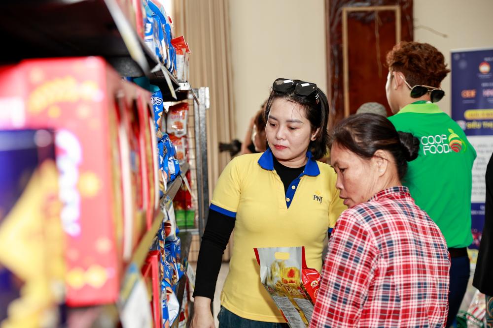 Bà Cao Thị Ngọc Dung, Chủ tịch HĐQT PNJ hỗ trợ bà con đi siêu thị mini 0 đồng 2026. Ảnh: Tấn Kiệt