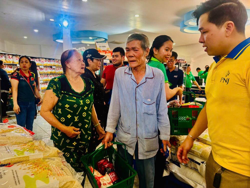 Các tình nguyện viên PNJ hỗ trợ bà con đi Siêu thị Mini 0 đồng. Ảnh: Tấn Kiệt