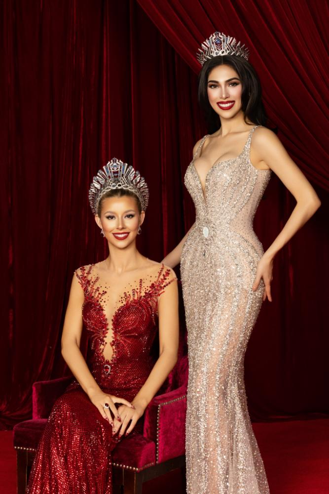 Bộ ảnh còn có sự xuất hiện của Miss Cosmo 2024 Ketut Permata Juliastrid Sari, cô diện lại bộ trang phục dạ hội từng xuất hiện trong đêm Chung kết Miss Cosmo 2024. Thiết kế với đường xẻ một bên giúp tôn chiều cao và đôi chân dài, đồng thời giữ nét sang trọng gắn liền với hình ảnh của cô trong nhiệm kỳ vừa khép lại. Runner-up Miss Cosmo 2024 Mook Karnruethai Tassabut, lựa chọn trang phục dạ hội màu đỏ đến từ thương hiệu GL GarlateDesign, cũng với đường xẻ lệch nhằm tạo sự linh hoạt trong chuyển động và nhấn vào phom dáng thanh thoát. Việc hai thế hệ đương nhiệm và tiền nhiệm cùng xuất hiện trong bộ ảnh không nhằm tái hiện các nhiệm kỳ, mà thể hiện mạch tiếp nối các giá trị đã được duy trì xuyên suốt trong Gia đình Hoàn Vũ.