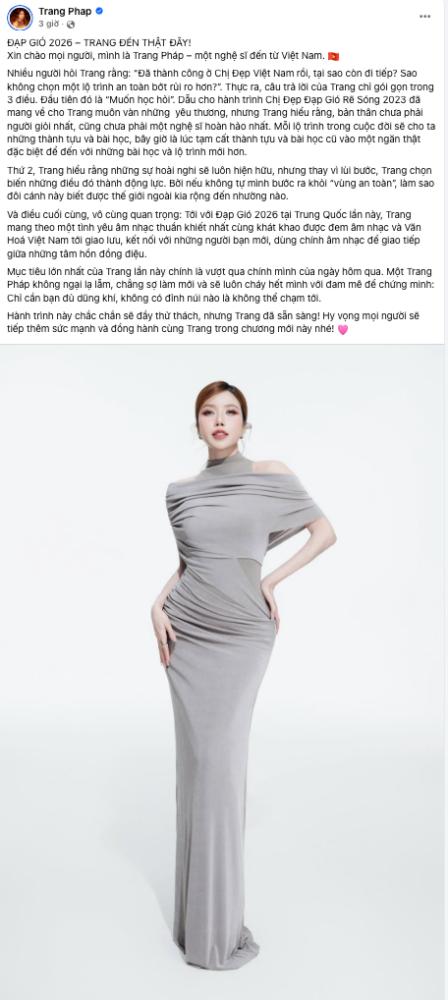 Ngày 27/3, Mango TV – Đài truyền hình Hồ Nam (Trung Quốc) đăng tải clip quảng bá công bố Trang Pháp sẽ tham gia chương trình “Đạp Gió 2026”. Theo Sina, cô cũng là là nghệ sĩ quốc tế duy nhất góp mặt vào chương trình năm nay.
